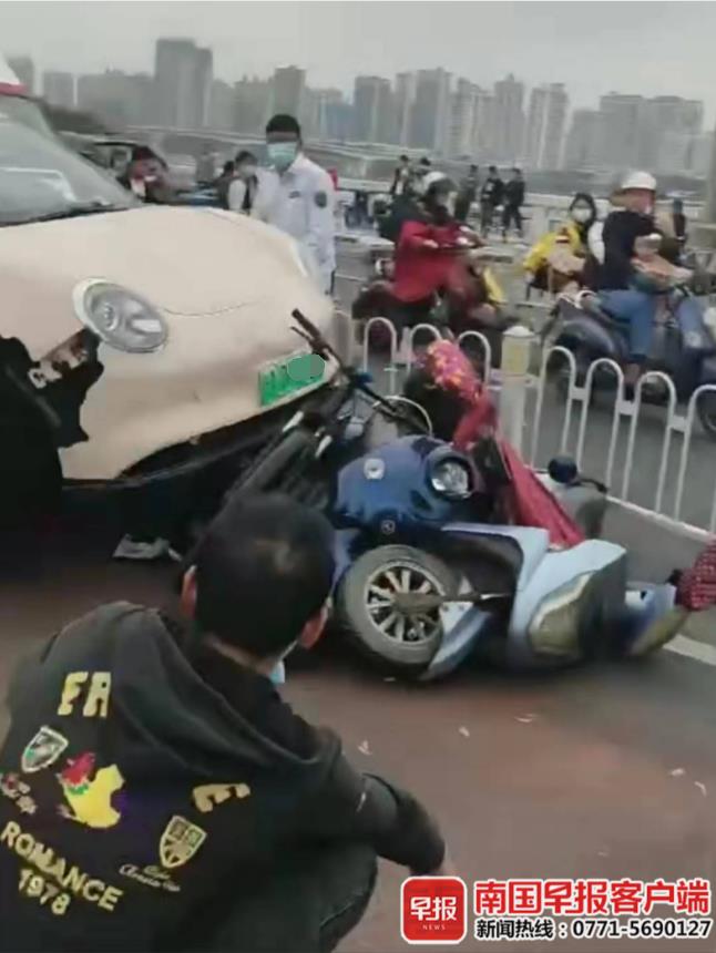 今天(2月18日)下午,南宁市邕江大桥上发生一起车祸,一辆行驶中的小轿车突然撞向非机动车道,与多辆电动自行车发生碰撞。