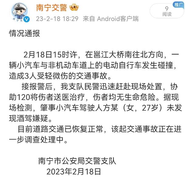 当天18时30分许,南宁市公安局交警支队发布情况通报称,事故造成3人受轻微伤。据现场检测,肇事小汽车驾驶人方某(女,27岁)未发现酒驾嫌疑。