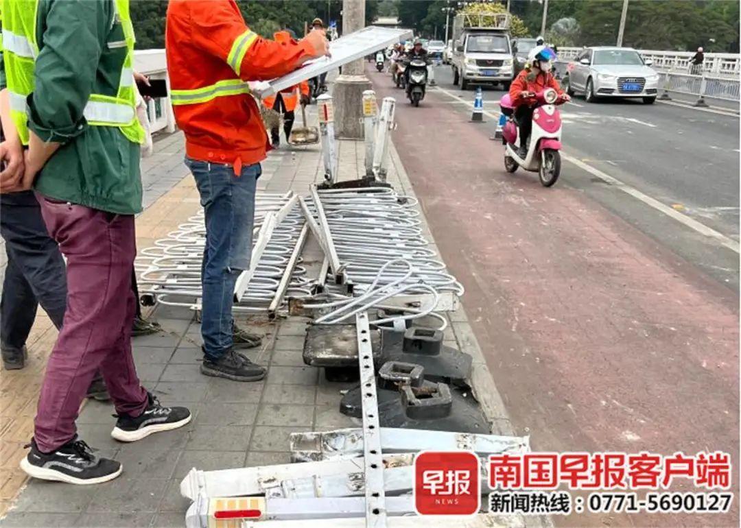 记者在现场了解到,15时许,一辆小轿车由南往北驶上邕江大桥,途中突然右倾撞向了机动车道与非机动车道上的护栏,冲毁护栏后,又撞上了在非机动车道上行驶的多辆电动自行车,导致多人不同程度受伤。