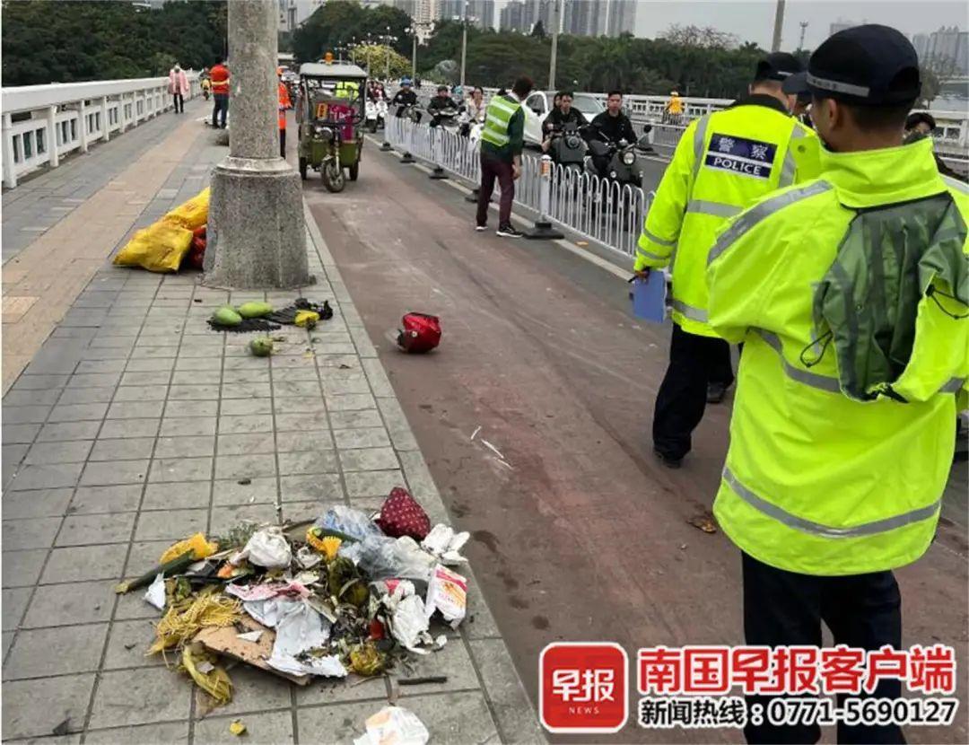 当天17时,南国早报记者赶到现场看到,数名交警正在现场处置,保险公司工作人员也在拍照取证,马路上留有一些车祸痕迹。多名环卫工人正在清扫路面,破损的马路护栏已被清理完毕,事故车辆已被拖走,交通逐渐恢复畅通。
