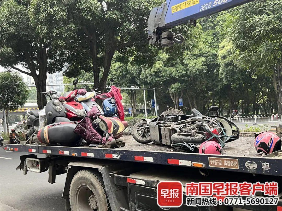 17时30分,记者在邕江桥南看到了事故车辆,小轿车右侧车头损毁严重,右前方轮胎几乎要掉落;6辆电动自行车和1辆山地自行车被装上拖车,其中两辆电动自行车损毁较为严重。