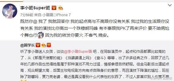 今日打开娱乐新闻就发现李小璐上了热门,原因是被质疑演技下滑,李小璐的回应引发了围观:既然你@我了,我就回答你,我的起点高与不高跟你没有关系,我过我的生活跟你没有关系,我的演技比你高出一个珠穆朗玛峰,有本事跟我PK了再来评价,要不咱俩尬个舞也行,因为我的转发你要火,不客气,晚安。