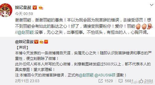 后来,娱记皇叔进行了公开道歉:本博今天发表的一条微博摘自天涯,实属无心之失。
