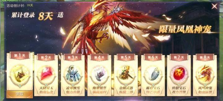 在玩家们进入轩辕传奇手游世界之后,达到一定级数会接到一个累计登录的任务,每日登录游戏都会获得一定的道具奖励:包括金票、赤星玉、时装、银票、时装武器、稀有宝石、经验宝石等等,当签到到达8天的时候系统就会免费赠送凤凰神宠,凤凰不仅仅外形炫酷,实力比35级灵宠更是强横许多。