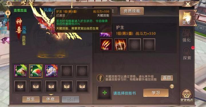 凤凰的天赋技能是护主,攻击时有一定概率进入护主状态,令自身承受的伤害降低20%,这个天赋技能绝对是初期宠物中最强力的技能了,一旦触发之后可以大幅降低敌人造成的伤害,非常适合战士和辅助药师这些需要坦度的职业使用。