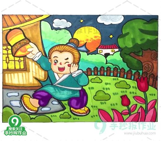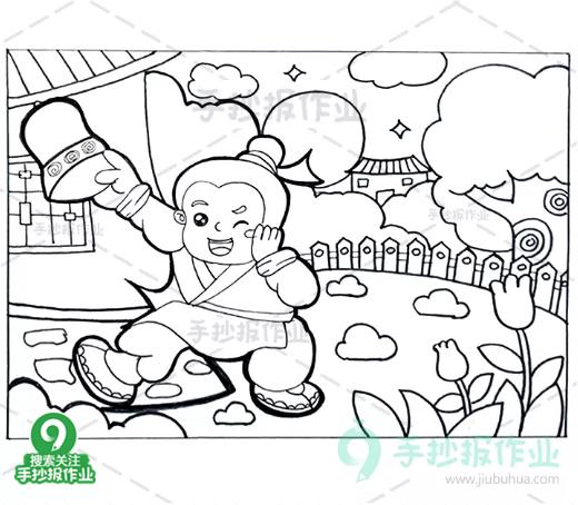 我们在一个长方形边框内画上一个古代男孩,一只手捂着自己的耳朵另外一只手在摘铃铛~