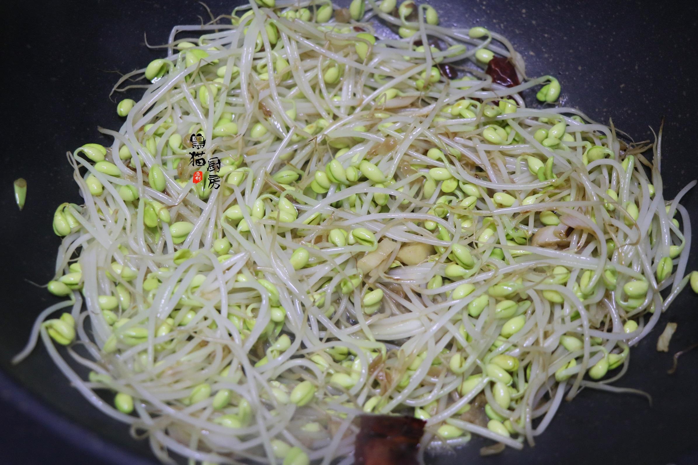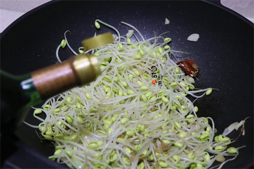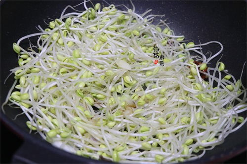 6.倒入黄豆芽,大火快速翻炒,炒黄豆芽要快火急炒。
