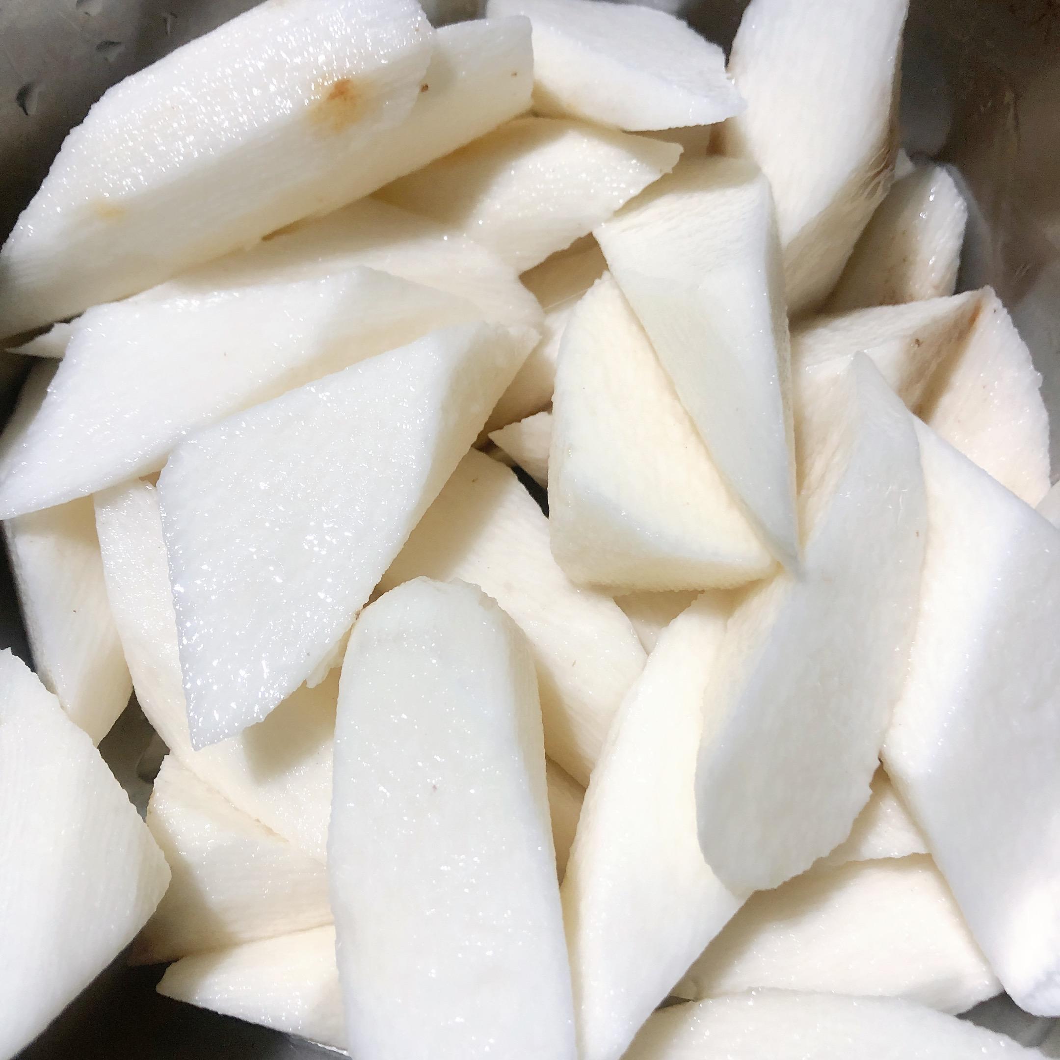 山药削皮切滚刀状备用(叮咚~~~温馨提示小编要变身了,正经不下去了,处理山药要戴手套哦,要不然接触了山药浆手会痒的,可在买的时候叫商家帮忙处理,拿回家洗洗直接用就好,(*^__^*) 嘻嘻……。)