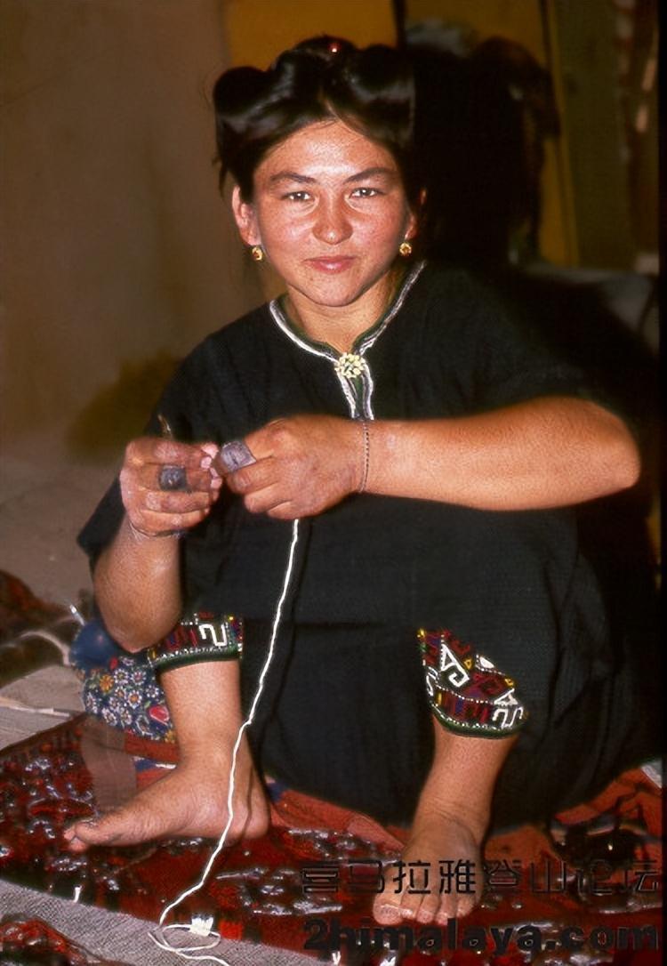 一位女性在土库曼斯坦Darvaza沙漠地区为手工地毯打结