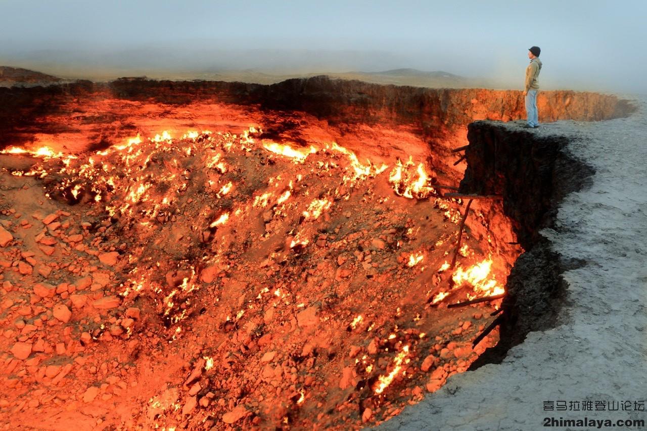 强烈的甲烷和硫的味道随风飘散几十英里。夜晚,沙漠的坑洞清晰可见,但是热度却仅集中在部分区域。随着你越来越接近这里,你开始感觉自己像是被放入烤箱中烘烤。内部的温度达到酷热的97.2˚C摄氏度。根据报道,中心区域的温度略低,但是相差无几。