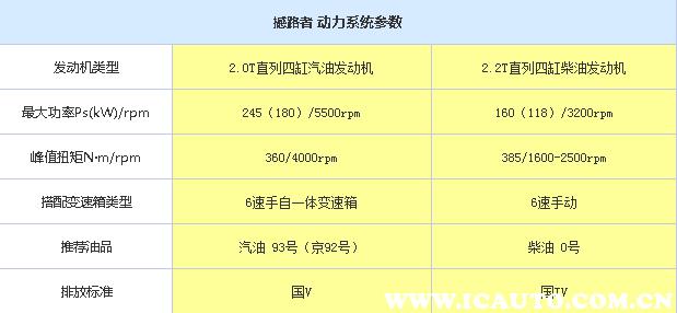 动力上,撼路者提供了两种选择,分别是最大功率245马力的2.0T汽油发动机和最大功率160马力的2.2T柴油发动机,其他汽油发动机匹配6速手自一体变速箱,而柴油版车型仅配备手动变速箱。动力性能的发挥撼路者还是不错的,一点都不输给其他硬派SUV。