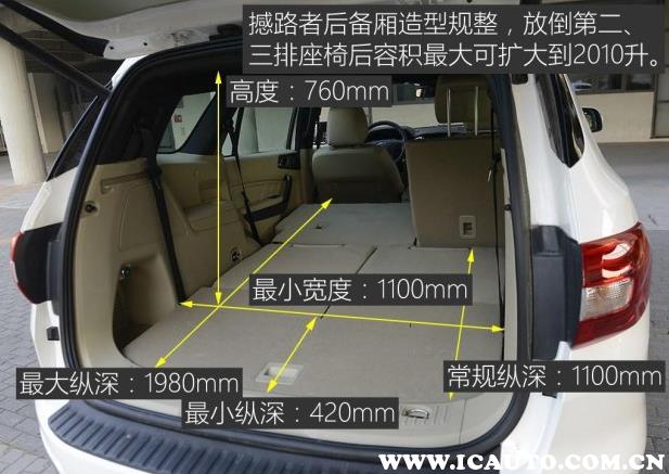 空间上,由于撼路者采用非承载车身,使得车内的头部空间比较局促,尤其是第三排座位。后备箱假如在第三排座椅翻起时显得很小,不过将第二排和第三排座椅放倒后,后备箱空间得到很大的扩充,容积能达到2010升。