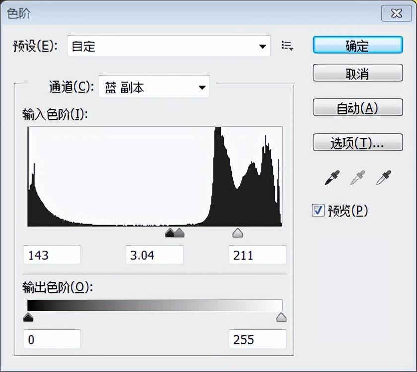 选中蓝色通道副本,进行抠图操作,点击调整色阶(图像—调整—色阶);