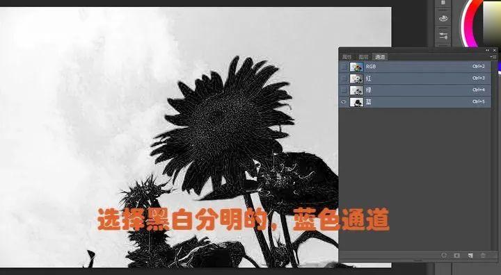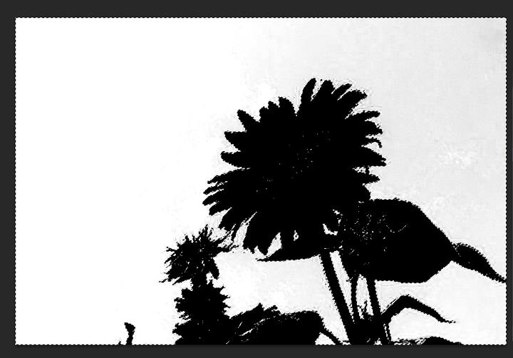 色阶调整后,画面的黑白效果更加分明,点击右下角的“圆圈”图标,选取除了向日葵的其他区域;