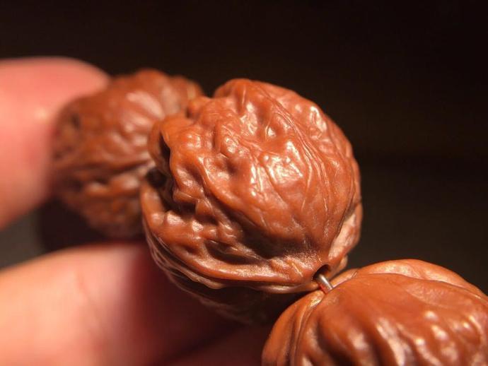 按照我个人的经验来说,当小核桃串清理完毕并初步包浆之后,基本此串将上进入了下一阶段。即五分盘五分刷,边盘边刷刷盘结合。首先当然是净手盘玩,均匀上色,刷到核桃表面无明显汗渍,也就是刷干,为的是上色匀称无花皮。