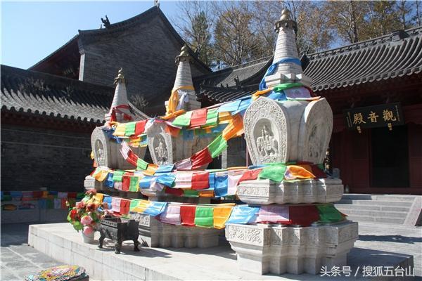 后院内尚建有该寺的标志性建筑—一三座佛塔。三塔寺就因这三塔而得名。这三座佛塔一溜儿排开,中间为文殊塔,北为普贤塔,南为观音塔。三塔等高,粗细一般,商约3米。塔基为正方形束腰须弥座,边长2.8米。塔身呈覆钵状,其上边建七层相轮和塔刹。此三塔原先为砖塔。因年久失修,渐呈颓唐之势。1987年,四川甘孜地区的藏族佛教徒朝拜五台山时,出资重建。目前呈现于我们面前的这三座佛塔,均为汉白玉佛塔,通体皆白,造型优美,为三塔寺最亮丽的景观。