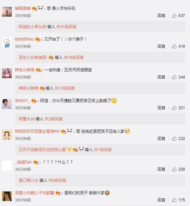 粉丝纷纷留言“哥,愚人节快乐!”“又开始了,你个骗子”拍完赶紧把孩子还给人家”,粉丝也是很机智了很皮了。