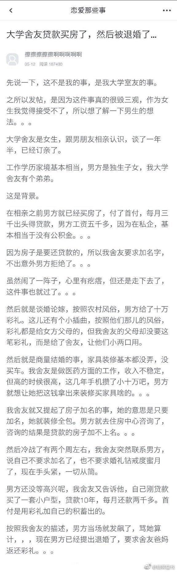 6.大学舍友贷款买房了,然后被退婚了 …