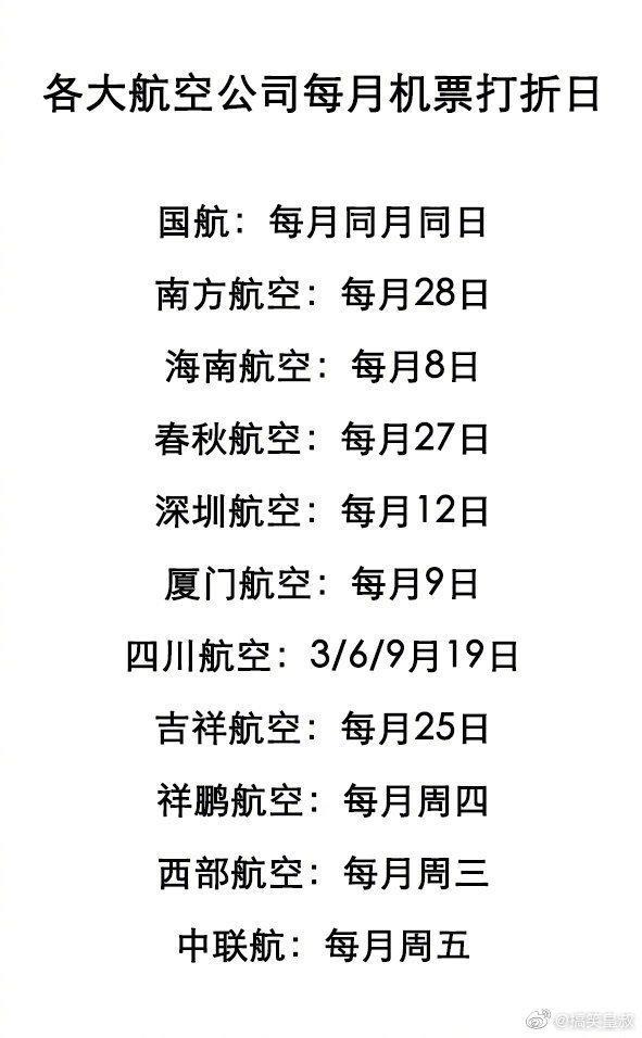 4.国内各大航空公司每月的机票打折日,马着以后肯定用的上!