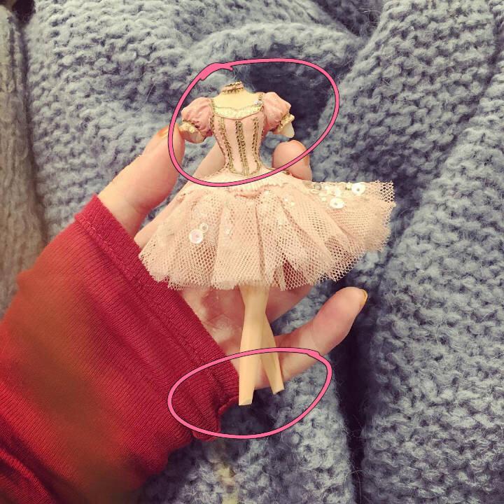照片中是一个穿着粉色连衣裙的娃娃,不过娃娃没有头没有手臂,脚掌貌似也被切掉了。