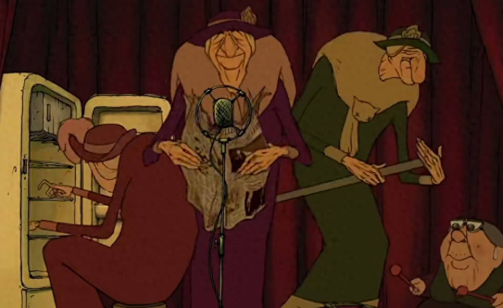 《疯狂约会美丽都》的美丽都三重唱姐妹应该是最吸引人眼球的人物。在曾经繁华的美丽都(即纽约),她们是红极一时的明星,当初的她们受到了许多人的热捧,但如今风烛残年的她们却很少接到邀约。现在的三姐妹一起住在了类似贫民窟的阁楼中,每天以池塘的青蛙为食。赖以生存的歌喉,也变成了报纸、冰箱和吸尘器,但即便生活已经落魄如此,她们三人依旧能够同睡一榻,看着电视中的人物剧情而开怀大笑。