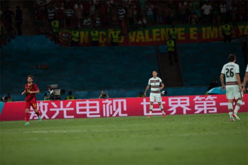 △“激光电视,世界第一”的广告出现在6月28日葡萄牙比利时的比赛现场