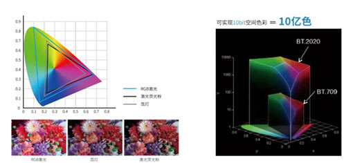 在中国工程院院士许祖彦看来,下一代的显示一定是激光显示——只有它能够同时实现国际电信联盟颁布的超高清显示标准“BT.2020”的三个要素:4K与8K超高清,色彩深度提升至10bit或12bit,色域覆盖率达到人眼可识别自然界色彩范围的70%以上。