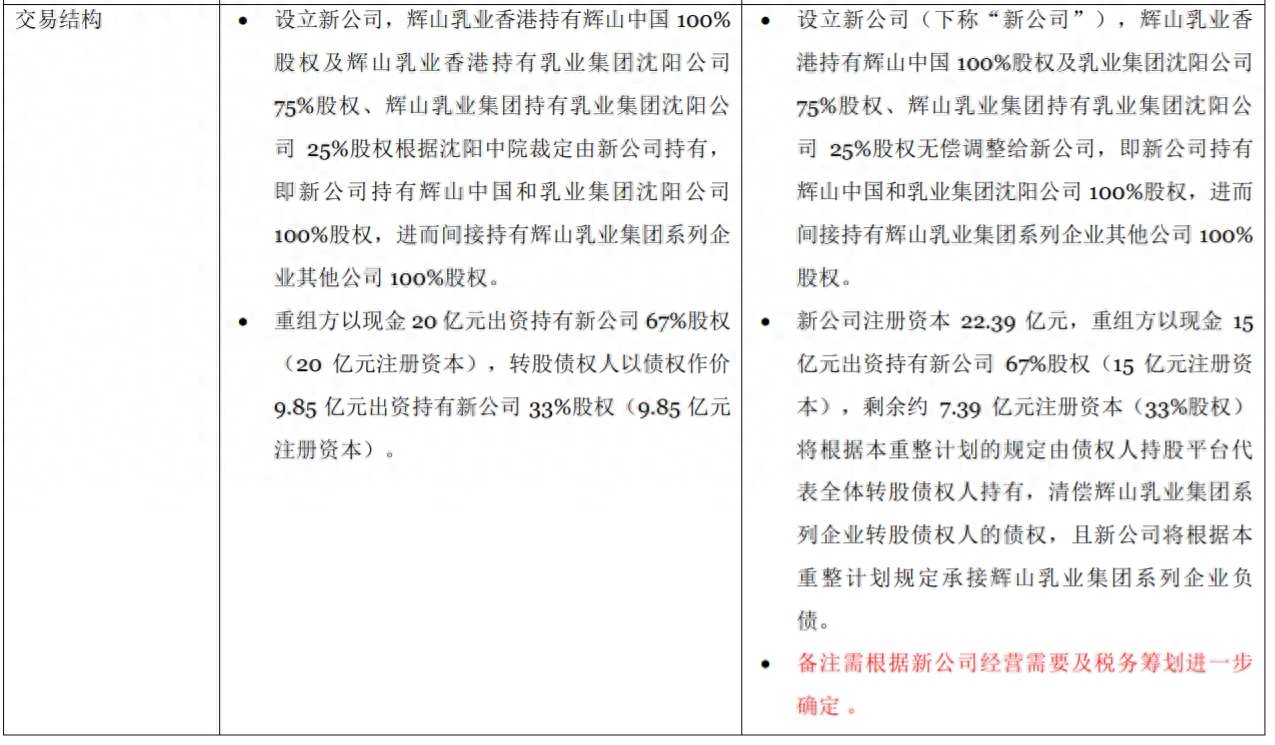 据对比方案显示,新希望集团拟以现金15亿元出资设立新公司,并持有新公司67%股权,剩余33%股权将由债权人持股平台代表全体转股债权人持有,清偿辽宁辉山乳业集团有限公司(简称“辉山乳业集团”)系列企业转股债权人的债权,且新公司将根据重整计划规定承接辉山乳业集团系列企业负债。