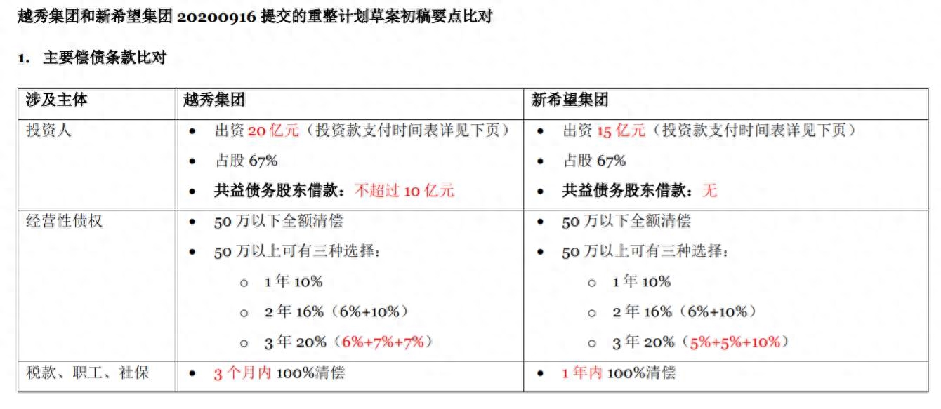 越秀集团和新希望集团提交的重整方案具体内容对比
