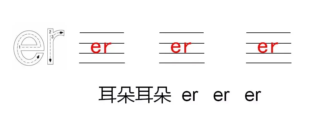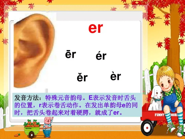 1.er是一个特殊韵母,只能自己独立成为音节,不能跟声母相拼组成音节,如 ér()、èr()、ěr()。