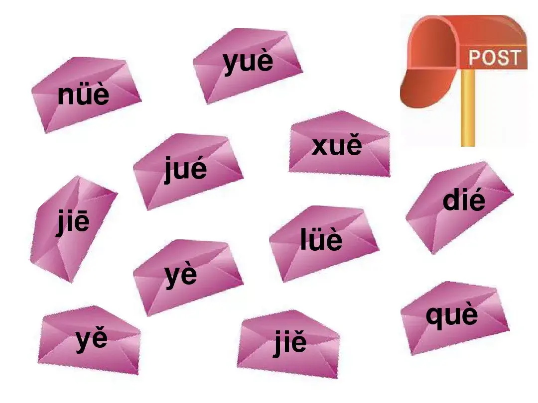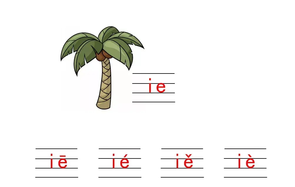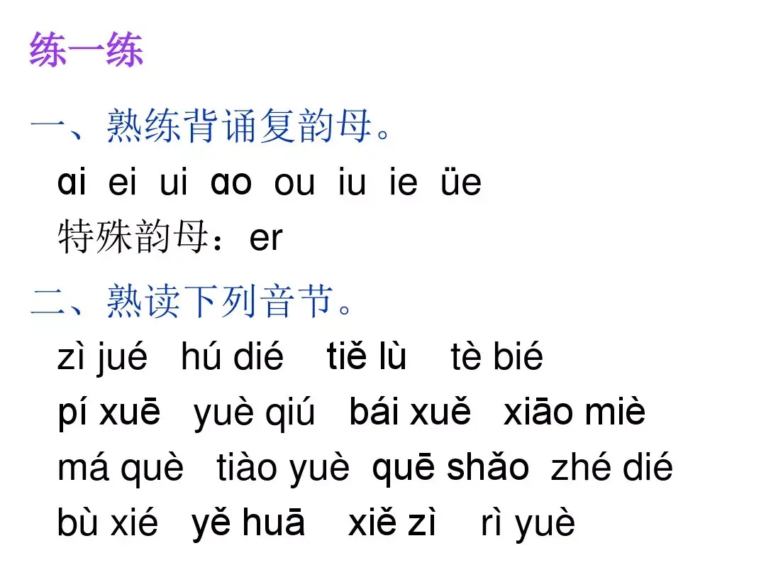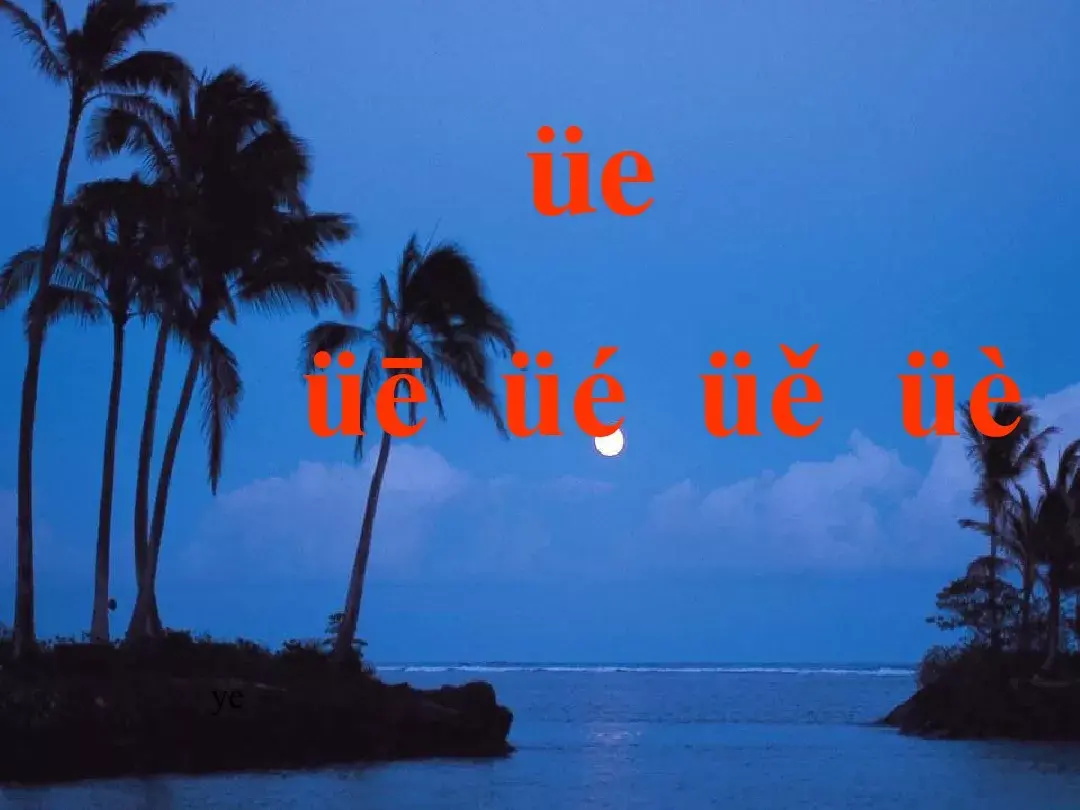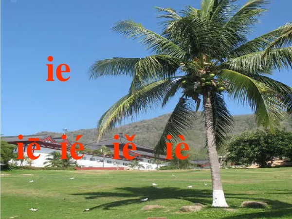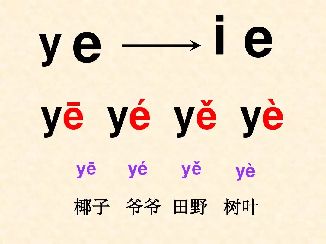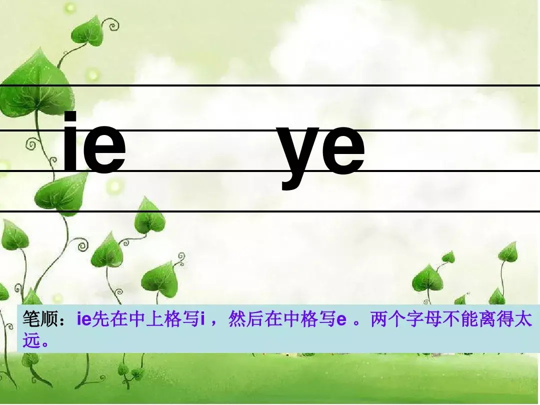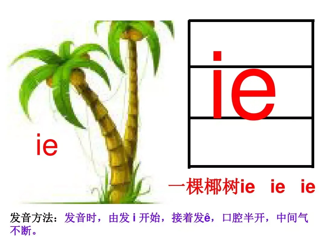 4.ye的发音与ie大体相同,口腔半开,中间气不断,但要读得稍长、响亮些。