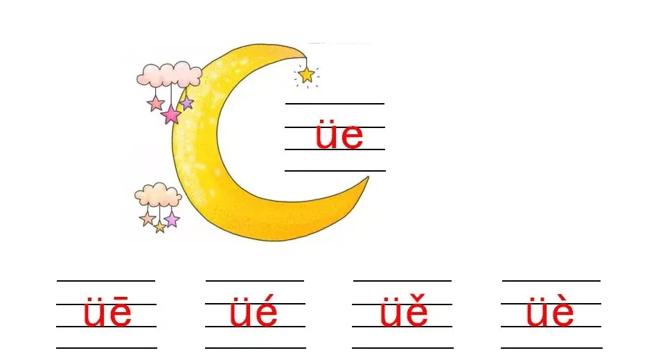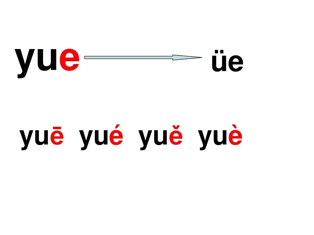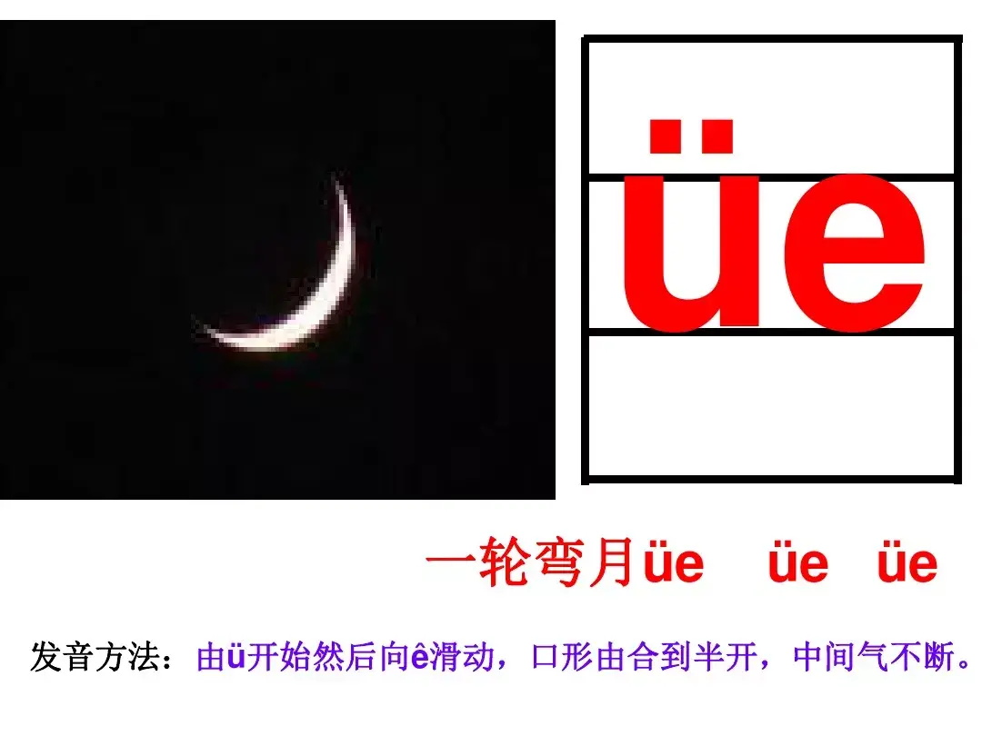 5.yue的发音与üe大体相同,口形由合到半开,中间气不断,但要读得稍长、响亮些。