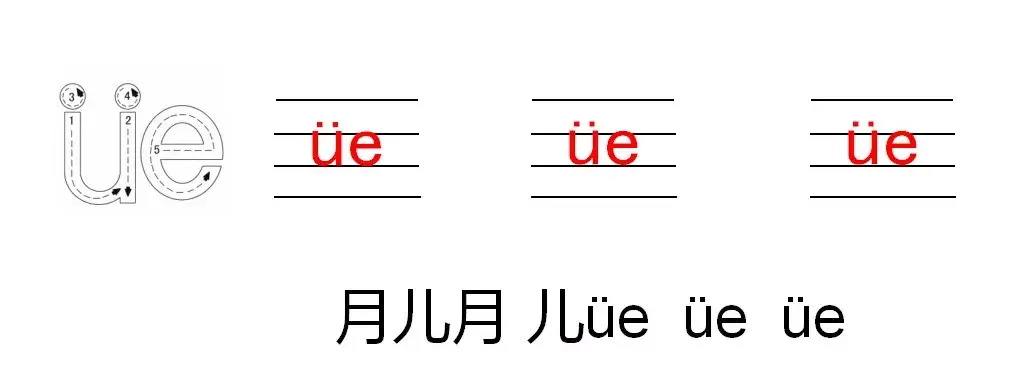 2.üe占上中格。先写ü,占上中格,再写e,占中格。ü上两点不要忘记,两个字母要写得紧凑。五笔写成。
