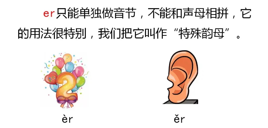 1.er是一个特殊韵母,只能自己独立成为音节,不能跟声母相拼组成音节,如 ér(儿童的”儿”)、èr(一、二的”二”)、ěr(耳朵的”耳”)。