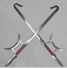 钩 中国武术器械之一,由戈演变而来。春秋战国时期,戈、钩、戟并用。从卫墓出土的铜钩看,钩的形状似戟,只是戟上边为利刃,而钩上边为一线钩形,故名钩。
