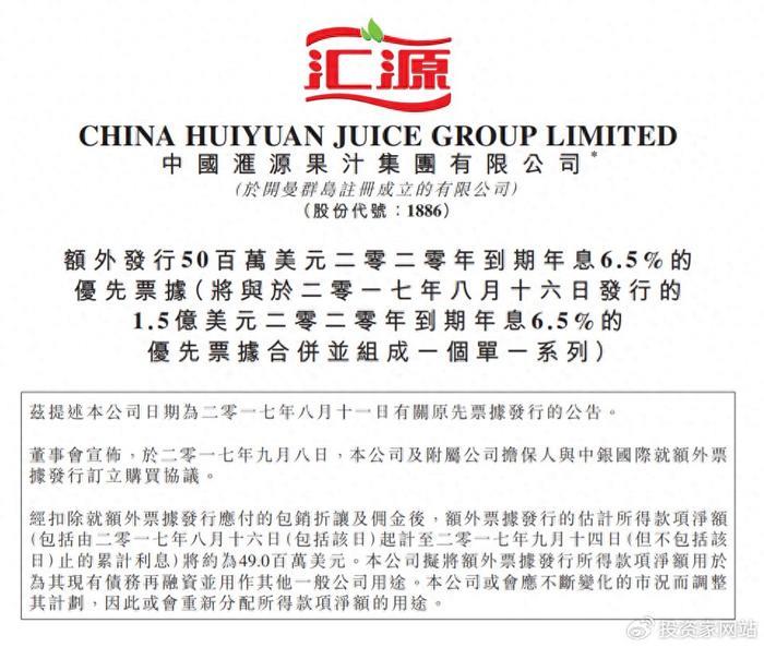 作为一家对冲基金BFAM Partners在2012年成立,主要是投资中国市场,以处置高收益房地产债务和不良证券资产而出名。而跟汇源果汁的债务起源于2017年,当时在香港上市的汇源果汁发布了2亿美元、年利率6.5%的优先票据(优先债),而这笔债务按照要求是要在2020年8月16日或之前偿还,且在到期之前的每年两次支付利息。