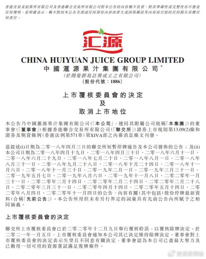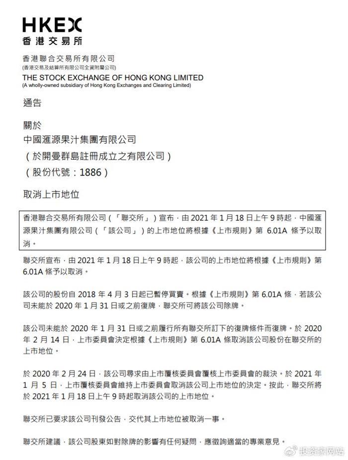 而后汇源果汁被2018年4月3日停牌,到了2021年1月18日,停牌近三年后被香港联交所摘牌正式退市。而后,公司的债务危机爆发,只能选择以物抵债,作为公司的原实控人朱新礼在2019年被列为失信执行人,代表的公司中国德源资本(香港)有限公司被法院查封,41亿元资产遭冻结。