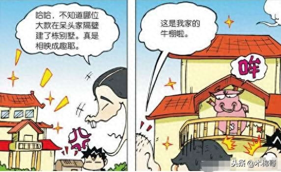 接着,贝有钱就看到了一栋非常漂亮的别墅,装修非常豪华。贝有钱笑着说,不知道哪位大款在呆头家隔壁建了栋别墅,真是相映成趣耶。一旁,旺财很是不爽。呆头就表示这栋别墅其实是他家的牛棚,然后么么就出现了。
