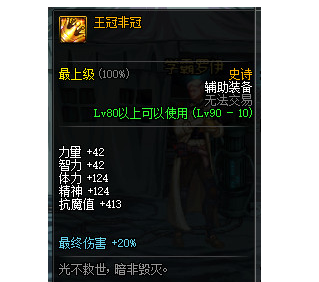 最后王冠非冠作为海博伦三件套之一,被吐槽的最多的一件大概就是这个左槽了。40+力智、124体精、20%最终伤害,无论是对于奶爸奶妈这种辅助还是对于所攻爆炸的B套C们而言,这件装备都显得很鸡肋。对比黄金杯的18属强和18%力智,我只想说这货真的丢人。