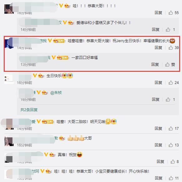 网友们看到朱桢官宣二胎,也都纷纷为他送上了祝福,并且也都表示羡慕他的幸福。