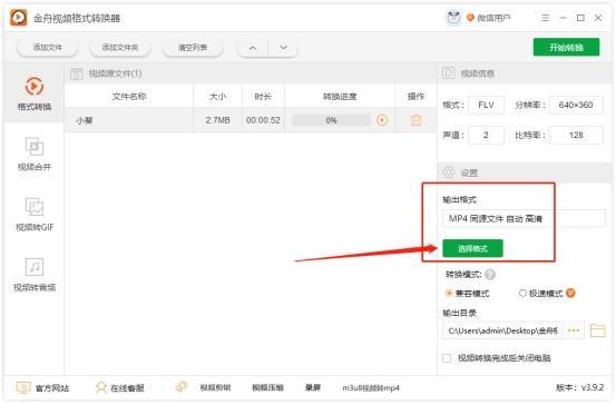 第二步、文件上传进来后,在右侧设置中选择输出格式,这里默认的是MP4格式,“选择格式”可以切换成其他格式;