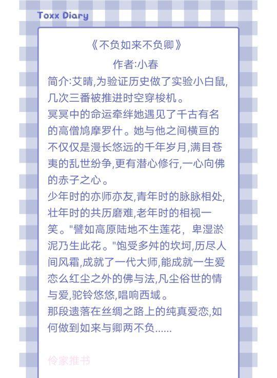 剧情设定:女主艾晴大学主修历史,为验证历史穿越遇到了男主高僧鸠摩罗什,第一次穿越,罗什13岁,两人亦师亦友;第二次穿越,两人都正在年华,暗中滋生情愫,让我们体会到无法放手却又不能靠近的两难境地,这本书历史底蕴浓厚,喜欢历史文化的伙伴们可以去看看。