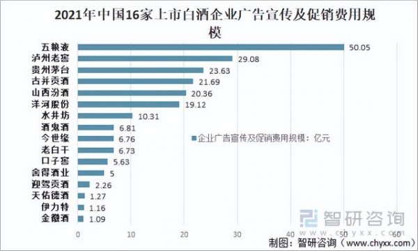 2021年,16家上市白酒企业共支出广告宣传及促销费用210.93亿元,占总销售费用的69.15%,占比提升0.29个百分点。其中:五粮液广告宣传及促销费用为50.0 5亿元;泸州老窖广告宣传及促销费用为29.08;贵州茅台广告宣传及促销费用为23.63亿元;古并贡酒广告宣传及促销费用为21.69亿元;山西汾酒广告宣传及促销费用为20.36亿元;洋河股份广告宣传及促销费用为19.12亿元;水井坊广告宣传及促销费用为10.31亿元;酒鬼酒广告宣传及促销费用为6.81亿元;今世缘广告宣传及促销费用为6.76亿元;老白干广告宣传及促销费用为6.73亿元;口子窖广告宣传及促销费用为5.63亿元;舍得酒业广告宣传及促销费用为5亿元;迎驾贡酒广告宣传及促销费用为2.26亿元;天佑德酒广告宣传及促销费用为1.27亿元;伊力特广告宣传及促销费用为1.16亿元;金徽酒广告宣传及促销费用为1.09亿元。