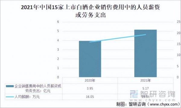 除茅台外,其余十五家企业销售费用中的人员薪资或劳务支出共5.17亿元,同比增长30.99%,2021年人均薪酬19.34万元,同比增长20.49%。