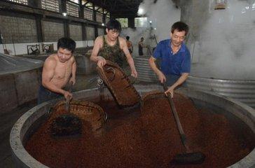 3.蒸煮糊化。菊花老师建议利用蒸煮使淀粉糊化。有利于淀粉酶的作用,同时还可以杀死杂菌。蒸煮的温度和时间视原料种类、破碎程度等而定。一般常压蒸料20~30分钟。蒸煮的要求为外观蒸透,熟而不粘,内无生心即可。 将原料和发酵后的香醅混合,蒸酒和蒸料同时进行,称为"混蒸混烧",前期以蒸酒为主,甑内温度要求85~90℃,蒸酒后,应保持一段糊化时间。 若蒸酒与蒸料分开进行,称之为"清蒸清烧"。