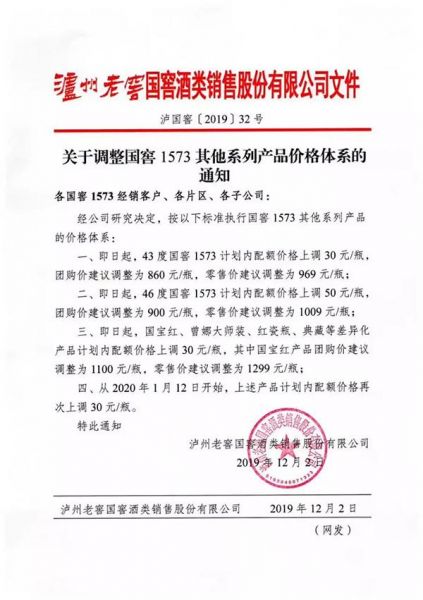 一,即日起,43度国窖1573计划内配额价格上调30元/瓶,团购价建议调整为860元/瓶,零售价建议调整为969元/瓶;
