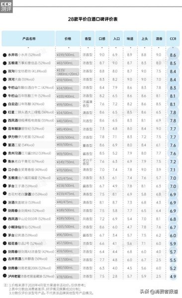 2020年4月,《消费者报道》汇总了京东、天猫、苏宁上热销的28款平价白酒(200元以下)的评价情况,对约6万条消费者评价数据进行分析及评分。