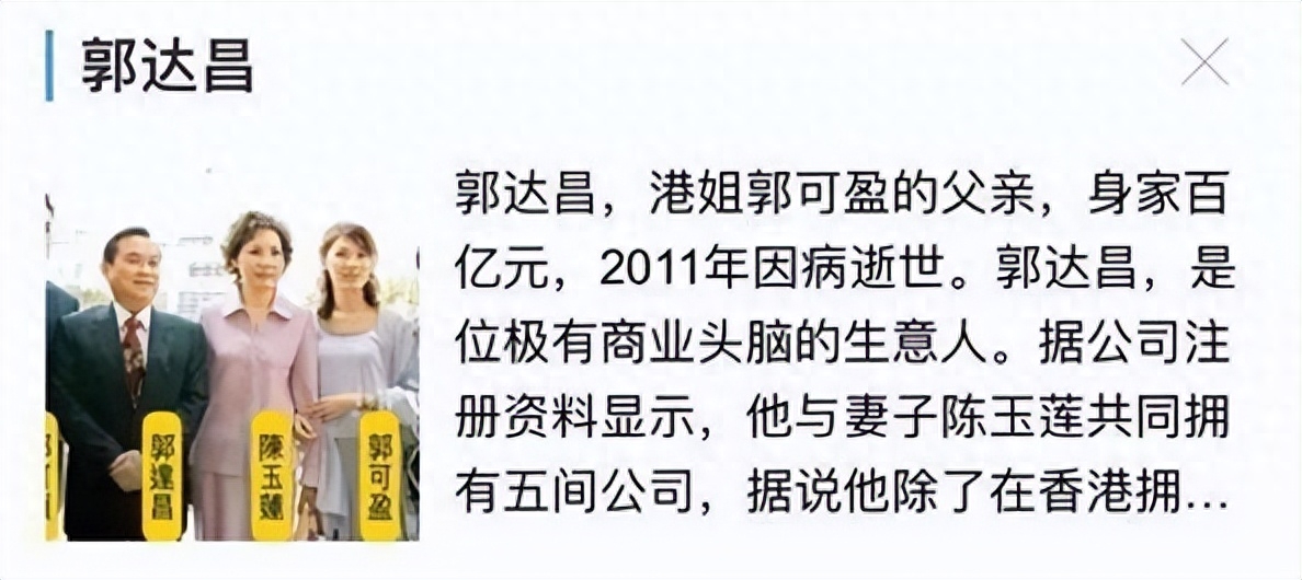 郭可盈父亲郭达昌是塑胶大王,在香港有众多豪宅商铺,身家百亿。