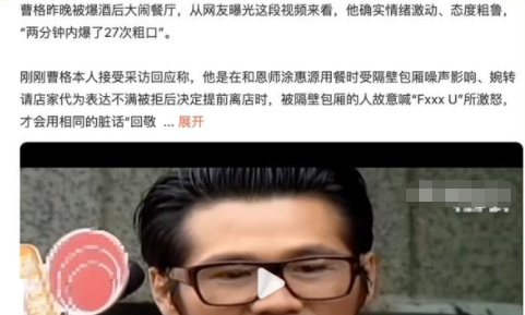 近日,喝酒上头的曹格在餐厅对隔壁桌客人出言不逊,气冲冲的他更是飙出满口英文脏话,在气势上把对方碾压了。