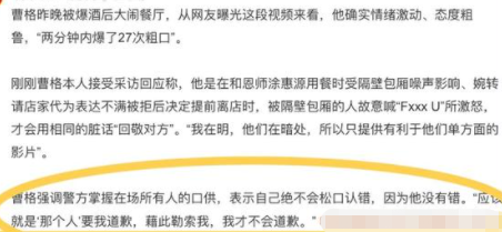 据称,当时曹格跟朋友正在餐厅吃饭聊天,但隔壁桌频频传来噪音,令他和朋友十分恼怒。刚开始他们只是提出建议,但没想到遭到了隔壁桌客人的脏话攻击。